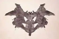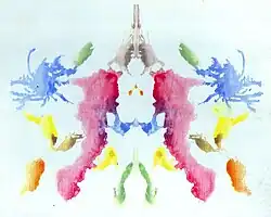 There are ten official inkblots, each printed on a separate white card, approximately 18 by 24 cm in size.[30] Each of the blots has near perfect bilateral symmetry. The inkblots include variations in color (some monochromatic, some multicolored) and shading, each potentially eliciting different types of responses.[31][32][33][34] According to various authors, they commonly evoke perceptions of animals, human figures, or abstract shapes, and may provoke associations related to authority, interpersonal dynamics, or sexuality.[35][36][37][38][39] Certain inkblots are also noted for thematic emphasis.[26] The test introduces increasing visual complexity and color, which can assess the subject's emotional and cognitive responses to less structured stimuli.[26] Together, the images are designed to reveal patterns in personality, thought processes, and affective functioning as the subject progresses through the test.