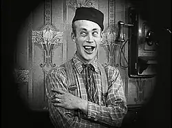 In 1932, Arbuckle signed a contract with Warner Bros. to star under his own name in a series of six two-reel comedies to be filmed at the Vitaphone studios in Brooklyn, New York. These six short films constitute the only samples of Arbuckle's voice, which recorded in a pleasant second-tenor range. Silent-film comedian Al St. John (Arbuckle's nephew) and actors Lionel Stander and Shemp Howard appeared with Arbuckle. The film How've You Bean? features grocery-store gags reminiscent of Arbuckle's 1917 short The Butcher Boy, with vaudeville comic Fritz Hubert as his assistant, dressed like Buster Keaton. The Vitaphone shorts were very successful in the US,[48] although when Warner Bros. attempted to release the first one (Hey, Pop!) in the United Kingdom, the British Board of Film Censors cited the ten-year-old scandal and refused to grant an exhibition certificate.[49]