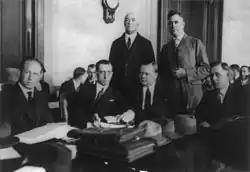The trial began on November 14, 1921 in the San Francisco city courthouse.[3] Arbuckle hired as his lead defense counsel Gavin McNab, a competent local attorney. The principal witness was Prevon.[32] At the beginning of the trial, Arbuckle told his estranged wife Minta Durfee that he had not harmed Rappe. Durfee believed him and appeared regularly in the courtroom to support him. Public feeling was so negative that shots were fired at Durfee as she entered the courthouse.[31]