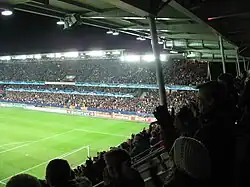 Lerkendal Stadion opened on 10 August 1947 as the main athletics and football venue in Trondheim, owned by the municipality.[25] Rosenborg took Lerkendal into use from the 1957–58 season. The first major rebuilding of the venue took place ahead of the 1962 season, when the wooden stands were torn and replaced with concrete stands on both long sides, and the south stand received a roof.[26] Floodlighting was installed in 1968 to allow UEFA club tournament matches to be held at the venue.[27] The official all-time record at Lerkendal is 28,569 from the 1985 season league match against Lillestrøm.[28] After the 1995 season, the first part of the current stadium was built to allow for modern facilities for UEFA matches.[29] The short sides were finished in 2001, and the final long stand was completed in 2002.[30] The expansion also saw Rosenborg and private investors purchase the stadium.[31]