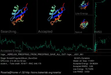 A primary feature of the Rosetta@home graphical user interface (GUI) is a screensaver which shows a current workunit's progress during the simulated protein folding process. In the upper-left of the current screensaver, the target protein is shown adopting different shapes (conformations) in its search for the lowest energy structure. Depicted immediately to the right is the structure of the most recently accepted. On the upper right the lowest energy conformation of the current decoy is shown; below that is the true, or native, structure of the protein if it has already been determined. Three graphs are included in the screensaver. Near the middle, a graph for the accepted model's thermodynamic free energy is displayed, which fluctuates as the accepted model changes. A graph of the accepted model's root-mean-square deviation (RMSD), which measures how structurally similar the accepted model is to the native model, is shown far right. On the right of the accepted energy graph and below the RMSD graph, the results from these two functions are used to produce an energy vs. RMSD plot as the model is progressively refined.[24]