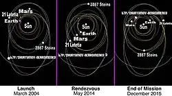 Rosetta was launched on 2 March 2004 from the Guiana Space Centre in Kourou, French Guiana, on an Ariane 5 rocket. In 2007, Rosetta made a Mars gravity assist (flyby).[28] The spacecraft also performed two asteroid flybys:[29] of 2867 Šteins in September 2008 and of 21 Lutetia in July 2010.[30]