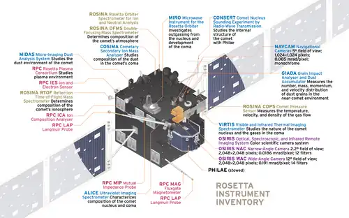 The spacecraft consisted of the Rosetta orbiter, which featured 12 instruments, and the Philae lander, with nine additional instruments.[27] The Rosetta mission orbited Comet Churyumov–Gerasimenko for 17 months and was designed to complete the most detailed study of a comet ever attempted.