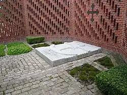 Opened on 23 September 1985,[41] it was the first burial site outside of the cathedral itself. The reason for the construction was twofold: it had been Frederik IX's wish to be buried outside the cathedral, in view of Roskilde Fjord (the King was a keen sailor and closely connected to the navy), and in any case there was no space left in the chapel of Christian IX.[42] It was only on the King's death in January 1972 that debate was opened on how his wish could be granted. A meeting was held in May of the same year, involving the municipality, the parochial church council, the National Museum of Denmark, and a foundation for building and landscaping culture. In 1974 a discussion paper was presented, which spelled out how the area would be preserved and the new burial site established. There was some opposition from members of the parochial council, who insisted that the tradition of burying monarchs inside the cathedral be upheld.[43] The zoning plan for the area was finished in 1982 and work on the burial site could begin.[44]