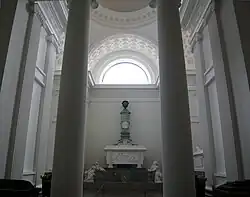 Upon the death of Christian IV in 1648 the interior had not been completed, and the King's coffin was placed in the crypt below instead. The King had commissioned his own monument, depicting him and his queen kneeling before a crucifix, but since it had been completed before his death, the monument had been temporarily placed in storage in the king's arsenal. When the arsenal burned in 1647, all that remained of the monument was the grand sandstone crucifix and a head carved from alabaster. The crucifix was subsequently placed in Holmen Church, while the head was given to the National Museum of Denmark.[32] Christian IV's successors were each unable to provide a fitting resting place for the King, and it was not until 1840 and Christian VIII that work was finally begun. He had hoped to see the project finished by 1848, the 200th anniversary of Christian IV's death, but it was not until 1870 that the work was completed.[33]