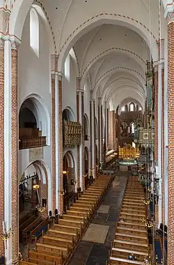 It has been accepted, that soon after he became Bishop of Roskilde in 1157, Absalon began to expand the travertine cathedral.[9] In 1160, the art of firing bricks was brought to Denmark from Italy by monks, and the new material was employed. Researchers decided to build a new cathedral around the existing one, allowing services to continue during construction. It has long been believed that Bishop Absalon began construction, and when Absalon was forced to surrender his position as bishop of Roskilde in 1191, only the two floors of the apse, the choir towers and part of the transept had been completed.[10] Absalon's successor, Peder Sunesen, embracing the new French Gothic style, later made significant changes to the plans, tearing down the choir towers and reducing the width of the transept.[11] But new research points to Peder Sunesen as the main initiator and hence instead of rebuilding it, it was constructed in the transition period between Romanesque and Gothic show elements from both styles in the cathedral.