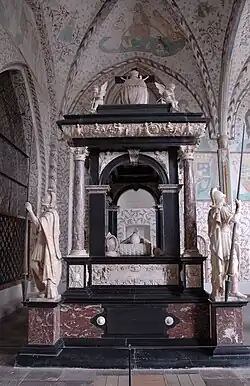 Frederick II's monument, crafted from the same materials, was built 1594–1598 by the Flemish sculptor Gert van Egen, who was a pupil of Cornelis Floris and was a resident of Elsinore. Both monuments are empty, however, as the coffins have been buried below the floor of the chapel.[27] King John was also supposed to have been buried in the chapel, but in his later years, he and his wife enjoyed living in Næsbyhoved Castle near Odense so much, that he expressed a preference to be buried in the town's Franciscan cathedral. However, the bishop and canons in Roskilde claimed that the King had determined that he was to be buried in Roskilde. The King's widow, Christina of Saxony, sent a letter to Pope Leo X asking for assistance, and in his reply, the Pope stated that a man's last wish must always be followed, and the King was therefore buried in Odense.[28]