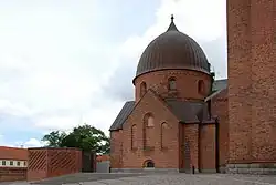 Construction of the chapel, overseen by a master builder Schledermann, began in 1919 and was completed in 1924, built in a Byzantine Revival style, with a Roman inspiration. Built as an extension of the northwestern weaponporch, which then ceased to exist as an independent building, the chapel is cruciform with grey walls and a domed roof.[38] Upon its completion, there was a heavy debate in the Danish newspapers, with some believing that the chapel was completely removed from the prevailing style of the cathedral.