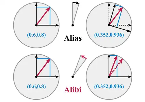 - The coordinates of a point P may change due to either a rotation of the coordinate system CS (alias), or a rotation of the point P (alibi). In the latter case, the rotation of P also produces a rotation of the vector v representing P. In other words, either P and v are fixed while CS rotates (alias), or CS is fixed while P and v rotate (alibi). Any given rotation can be legitimately described both ways, as vectors and coordinate systems actually rotate with respect to each other, about the same axis but in opposite directions. Throughout this article, we chose the alibi approach to describe rotations. For instance,