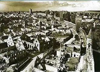 In March 1945, during World War II, German soldiers were stationed in Rothenburg to defend it. On March 31, bombs were dropped over Rothenburg by 16 planes, killing 37 people and destroying around 275 houses (around 32% of all houses), six public buildings and damaging nine watchtowers and over 2,000 feet (610 m) of the wall. Because incendiary bombs were used most outer walls still stood after the attack and were used to rebuild the newer eastern part of the old town. Around 265 houses were rebuilt. The U.S. Assistant Secretary of War, John J. McCloy, knew about the historic importance and beauty of Rothenburg, so he ordered U.S. Army General Jacob L. Devers not to use artillery in taking Rothenburg. Battalion commander Frank Burke, a future Medal of Honor recipient, ordered six soldiers of the 12th Infantry Regiment (United States), 4th Division to march into Rothenburg on a three-hour mission and negotiate the surrender of the town. First Lieutenant Noble V. Borders of Louisville, Kentucky, First Lieutenant Edmund H. Austgen of Hammond, Indiana, Private William M. Dwyer of Trenton, New Jersey, Private Herman Lichey of Glendale, California, Private Robert S. Grimm of Tower City, Pennsylvania, and Private Peter Kick of Lansing, Illinois were sent on the mission. When stopped by a German soldier, Private Lichey, who spoke fluent German and served as the group's translator, held up a white flag and explained, “We are representatives of our division commander. We bring you his offer to spare the city of Rothenburg from shelling and bombing if you agree not to defend it. We have been given three hours to get this message to you. If we haven’t returned to our lines by 1800 hours, the town will be bombed and shelled to the ground.”[6] The local military commander Major Thömmes gave up the town, ignoring the order of Hitler for all towns to fight to the end and thereby saving it from total destruction by artillery. American troops of the 12th Infantry Regiment, 4th Division occupied the town on April 17, 1945, and in November 1948, McCloy was named an honorary citizen (German: Ehrenbürger) of Rothenburg.