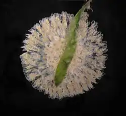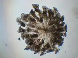 Colonial rotifers, tentatively identified as Conochilus. The colony is less than 1 mm in diameter, but visible to the naked eye.