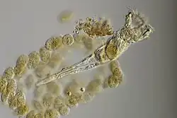 Resting eggs enclose an embryo encysted in a three-layered shell that protects it from external stressors.[33][34] They are able to remain dormant for several decades and can resist adverse periods (e.g., pond desiccation or presence of antagonists).[35][36] When favourable conditions return and after an obligatory period of diapause which varies among species, resting eggs hatch releasing diploid amictic females that enter into the asexual phase of the life cycle.[30][37]