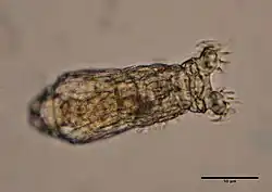 The Rotifera, strictly speaking, are confined to the Bdelloidea and the Monogononta. Rotifera, Acanthocephala and Seisonida make up a clade called Syndermata.[18] The findings of a fossil called Juracanthocephalus shares features with both Seisonidea and Acanthocephala, suggesting that they are sister groups.[19]
