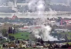 The lakeshore was a prominent site of skirmishes during the New Zealand Wars of the 1860s. William Fox advocated for turning the Rotorua region into a national park, inspired by the Yellowstone in the United States.[23] Conversely, the Te Arawa community suggested the establishment of a township centred around Rotorua's thermal springs, with the intent of developing a Polynesian Spa and health resort where tourists could indulge in hot pools.[23] In 1880, instead of selling the land, the Ngāti Whakaue people leased 50 acres to the Crown under the Fenton Agreement,[24][25] granting the government the authority to offer 99-year leases on their behalf.[23] Revenues from leases helped fund Rotorua Boys' High School, and increased significantly upon the expiry of the 99-year leases.[26] The eponymous Fenton Street in the modern city's CBD bears the judge's name.[27] Nevertheless, the enactment of the Thermal Springs District Act in 1881 gave the government exclusive rights to both purchase and lease lands containing hot springs, lakes, or river, and as a result, by the turn of the century, nearly half of the Rotorua blocks were sold.[23] In 1993, the Crown settled a Treaty of Waitangi claim with the Ngāti Whakaue people to honour their broken contract, by agreeing to return the gifted lands that were no longer required for their original use.[28]