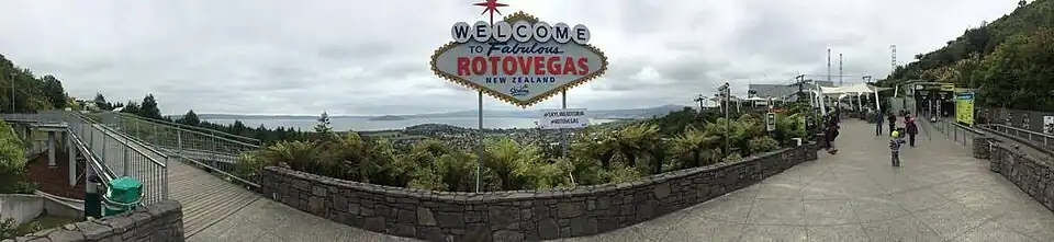 A common nickname for Rotorua is "Sulphur City" due to the hydrogen sulphide emissions, which gives the city a smell similar to "rotten eggs",[1] as well as "Rotten-rua" combining its legitimate name and the rotten smell prevalent.[12] Another common nickname is "Roto-Vegas", likening the city's own strip of road flanked by businesses and restaurants to that of Las Vegas.[13]