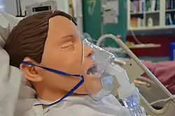 A dummy wears a nebulizer mask, used to administer inhaled medications.