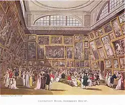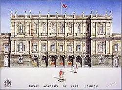 The Royal Academy was initially housed in cramped quarters in Pall Mall, although in 1771 it was given temporary accommodation for its library and schools in Old Somerset House, then a royal palace.[11] In 1780, it was installed in purpose-built apartments in the first completed wing of New Somerset House, located in the Strand and designed by Chambers, the Academy's first treasurer.[11] The Academy moved in 1837 to Trafalgar Square, where it occupied the east wing of the recently completed National Gallery (designed by another Academician, William Wilkins).[12] These premises soon proved too small to house both institutions. In 1868, 100 years after the Academy's foundation, it moved to Burlington House, Piccadilly, where it remains.[13]