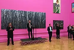 Under the direction of former exhibitions secretary Sir Norman Rosenthal, the Academy has hosted ambitious exhibitions of contemporary art. In its 1997 "Sensation", it displayed the collection of work by Young British Artists owned by Charles Saatchi. The show was controversial for its display of Marcus Harvey's portrait of Myra Hindley, a convicted murderer. The painting was vandalised while on display.[22]