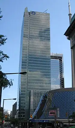 RBC installed its first computer in 1961, the IBM 1401, the first to do so in Canadian banking.[21] In the 1960s, RBC Insurance was created.[13] In 1968, it merged with Ontario Loan and Debenture Company (formerly Ontario Savings and Investment Society).[22] RBC Insurance is the largest Canadian bank-owned insurance organization, with services to over five million people. It provides life, health, travel, home and auto and reinsurance products as well as creditor and business insurance services.[13] The completion of Royal Bank Plaza in Toronto in 1976 saw the relocation of many critical head-office functions from Montreal, with Toronto serving as RBC's corporate headquarters ever since.[23] In 1993, RBC merged with Royal Trust.