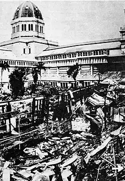 The wing of the building which once housed Melbourne Aquarium burnt down in 1953. It was a venue for the 1956 Summer Olympics, hosting the basketball, weightlifting, wrestling, and the fencing part of the modern pentathlon competitions.[22][23] During the 1940s and 1950s, the building remained a venue for regular weekly dances. Over some decades of this period it also held boat shows, car shows and other regular home and building industry shows. It was also used during the 1950s, 1960s and 1970s for State High School Matriculation and for the Victorian Certificate of Education examinations, among its various other purposes. The western annexe was demolished in the 1970s.[24] The last remaining original annex, the grand ballroom, was demolished amid controversy in 1979.[25]