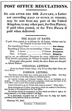 Greater changes took place when the Uniform Penny Post was introduced on 10 January 1840, whereby a single rate for delivery anywhere in Great Britain and Ireland was pre-paid by the sender.[24] A few months later, to certify that postage had been paid on a letter, the sender could affix the first adhesive postage stamp, the Penny Black, which was available for use from 6 May the same year.[25] Other innovations were the introduction of pre-paid William Mulready designed postal stationery letter sheets and envelopes.[26]