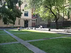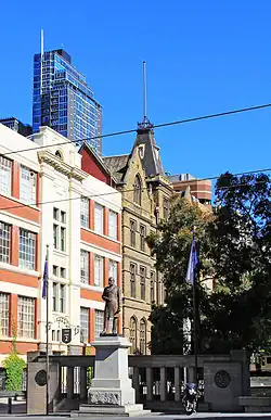 The city block bound by Bowen Street, Franklin Street, La Trobe Street and Russell Street, served as the justice precinct of the city for over 100 years. While it is mostly occupied by campus buildings today, which were constructed over the site of the demolished Old Melbourne Gaol, some original buildings from the precinct remain and are used by the university. From the Old Melbourne Gaol, they include its east wing cell block (1854) which is now operated as a museum by the National Trust of Australia, its former chapel and gatehouse (1860) which are now used as a multi-faith place of worship for the campus, and the site of its former hospital which is now used as a landscaped space known as Alumni Courtyard. Other buildings from the precinct that remain are the former Melbourne City Watchhouse (1904) which is also operated as a museum by the National Trust, and the former Melbourne Magistrates' Court (1914) which is now used to house university administration.[23][24]