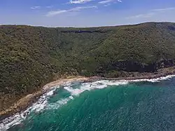 - ^ This view of the southern region of the Royal National Park coastline, pictured in May 2009, depicts North Era Beach (foreground) and South Era Beach (behind North Era), with Semi-Detached Point visible as the thin stretch of land visible at the left of South Era in this image. A chain of mountains that form part of the Illawarra Escarpment can be visible in the distance behind Semi-Detached Point. Mount Mitchell is the most distant discernible feature in this image.