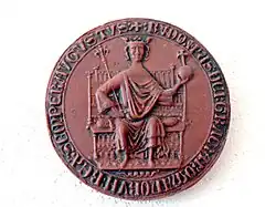 ![]() Seal of Rudolf I inscribed: RUDOLFUS DEI GRACIA ROMANORUM REX SEMPER AUGUSTUS ("Rudolf by the grace of God King of the Romans, ever majestic") | |