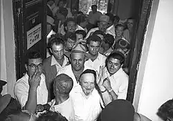From late June and into July 1944, material from the Vrba–Wetzler report appeared in newspapers and radio broadcasts in the United States and Europe, particularly in Switzerland, prompting world leaders to appeal to Hungarian regent Miklós Horthy to halt the deportations.[13] On 2 July, American and British forces bombed Budapest, and on 6 July, in an effort to exert his sovereignty, Horthy ordered that the deportations should end.[14] By then, over 434,000 Jews had been deported in 147 trains—almost the entire Jewish population of the Hungarian countryside—but another 200,000 in Budapest were saved.[b]
