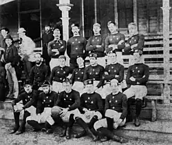 The 'Waratah' Rugby Club invited Australian rules football club, the Carlton Football Club, to play two matches, one under rugby rules and one under Australian rules.[18] On Saturday 23 June 1877, 3,000 spectators watched Waratah beat Carlton at rugby at the Albert Cricket Ground in Redfern.[18] In the return leg, Carlton defeated Waratah under Australian rules.[18] The first inter-colonial game occurred on 12 August 1882, when players from the four Queensland clubs (who played both rugby and Australian rules football) travelled to NSW. NSW won by 28 points to 4 at the Association Ground (later to be renamed the Sydney Cricket Ground) in front of 4,000 spectators.[19] Later that same year, the Southern Rugby Union undertook its inaugural tour of New Zealand, winning four of its seven matches.[20]