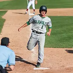 - With a runner on third and two outs, batter hits a fly ball over centerfielder's head. It bounces several times as it rolls to the wall. The runner on third runs safely home and easily scores a run. Meanwhile, the batter safely reaches first, then tries to advance to second. The centerfielder, having retrieved the ball, throws the ball to the second baseman and the runner is tagged out as he slides into second. Since the runner stepped on home plate before the batter was tagged out at second for the third out of the inning, his run will count.[1]
