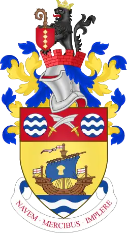 Runcorn Urban District was enlarged on three occasions. In 1936, it took in areas including Weston and the fringes of Halton, including the area around Halton Grange. In 1955, there were minor adjustments to the boundaries with neighbouring parishes. And in 1967, it took in Halton and Norton, plus parts of other neighbouring parishes, to bring all the areas which had been designated for the new town in 1964 into the urban district.[56][57] In 1956, the urban district council was granted a coat of arms with the Latin motto Navem mercibus implere ("fill the ships with goods"), a classical quotation from Juvenal.[58]