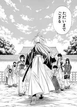 Fascinated by the Shinsengumi, Watsuki based characters on historical members and fictional representations from Japan's Bakumatsu period.[13][14] He found historical characterization challenging. After difficulties with Sagara Sōzō, he designed Saitō Hajime in his own style, diverging from history, and was pleased with the result.[11] However, he noted that some Japanese Shinsengumi fans objected to Saitō's sadistic portrayal.[13] The final scene of Kenshin returning to the dojo was inspired by the first opening of the anime adaptation, "Sobakasu" by Judy and Mary.[15]