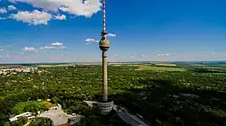 Ruse is on the right bank of the river Danube, which is the high bank, having two underwater terraces and three river terraces at 15 to 22 m (49.21–72.18 ft), 30 to 66 m (98.43–216.54 ft), and 54 to 65 m (177.17–213.25 ft). The average altitude is 45.5 m (149.28 ft) AMSL. The urban area is an approximately 11-km ellipse running along the river. The city extends from the land-connected Matey (Матей) island and the mouth of Rusenski Lom on the west to Srabcheto (Сръбчето) hill on the east. During the 20th century, the west end of the city was significantly modified by moving the mouth of Rusenski Lom to the west, as well as by moving the bank itself with its fairway considerably to the north. Sarabair (саръбаир, from Turkish Sarıbayır meaning "Yellow Slope") hill is to the south of the city and is 159 m (521.65 ft) high. The Rousse TV Tower is built there on the remains of Leventtabia, a former Turkish fortification.