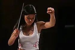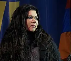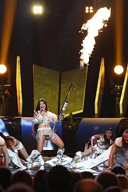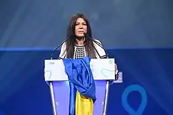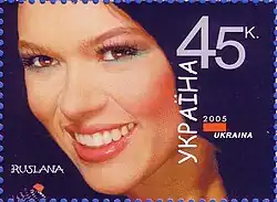 Ruslana Stepanivna Lyzhychko (Ukrainian: Руслана Степанівна Лижичко, IPA: [rʊsˈlɑnɐ steˈpɑn⁽ʲ⁾iu̯nɐ lɪˈʒɪtʃko]; born 24 May 1973),[4] known mononymously as Ruslana, is a Ukrainian singer, songwriter, producer, activist and former politician. She is a World Music Award and Eurovision Song Contest winning recording artist,[5] holding the title of People's Artist of Ukraine.[6] She is also a former MP serving as deputy in the Ukrainian parliament (Verkhovna Rada) for the Our Ukraine Party.[7] Ruslana was the UNICEF Goodwill Ambassador in Ukraine in 2004–2005.[8] She is recognized as the most successful Ukrainian female solo artist internationally[9][10] and was included in the top 10 most influential women of 2013 by the Forbes magazine.[11] The U.S. Secretary of State honored her with the International Women of Courage Award in March 2014.[12] She has been named an honorary citizen of her hometown Lviv[13] and was nominated to receive the title Hero of Ukraine.[14]