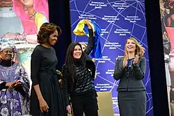 For her extraordinary courage, commitment and dedication Ruslana was honoured with several awards including the International Woman of Courage Award, awarded by First Lady Michelle Obama at the Woman in the World Summit in New York[79] and the 2014 Distinguished Humanitarian Leadership Award from at the Atlantic Council in Washington, D.C.[80]