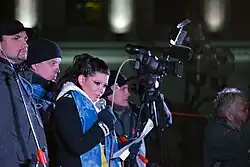 In total Ruslana spent at least 100 days and 100 nights on the Maidan stage during the cold winter inspiring the crowds, giving speeches and singing the Ukraine national anthem every hour day after day and night after and night, often sleeping just a couple of hours on the floor of the Trade Union building occupied by the protesters.[66] As a symbol of people power, peace and freedom she established holding up flashlights while singing the Ukraine national anthem.