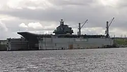 Admiral Flota Sovetskogo Soyuza Kuznetsov (Russian: Адмира́л фло́та Сове́тского Сою́за Кузнецо́в, "Admiral of the Fleet of the Soviet Union Kuznetsov") is an aircraft carrier (heavy aircraft cruiser in Russian classification) which has served as the flagship of the Russian Navy, although she has been out of service since 2017. She was built by the Black Sea Shipyard, the sole manufacturer of Soviet aircraft carriers, in Nikolayev within the Ukrainian Soviet Socialist Republic (Ukrainian SSR) and launched in 1985, becoming fully operational in the Russian Navy in 1995. The initial name of the ship was Riga; she was launched as Leonid Brezhnev, embarked on sea trials as Tbilisi, before she was finally named after Admiral of the Fleet of the Soviet Union Nikolay Gerasimovich Kuznetsov.[7]