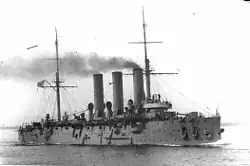 During the Battle of Tsushima Aurora was only lightly damaged. Despite this, the ship's captain, Evgeny Egoriev, was killed. At nightfall, Aurora along with Oleg, were attacked by torpedo boats and at 22:00 they gave up trying to proceed north and headed southwest.[11] Once dawn arrived it was found that Zhemchug had retreated with the other two ships.[12] Enkvist decided transfer his command to Aurora then take his ships to Manila and American internment.[12] On the way to Manila, the ship's doctor managed to set up the ship's X-ray equipment and performed the first post battle X-rays in Russian naval history.[13] Evgeny Egoriev was buried at sea on 3 June 1905.[14]