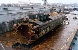 ![]() Wreck of Kursk in a floating dock at Roslyakovo. | |
