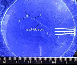 In a cloud chamber, a 5.3 MeV alpha particle track from a 210Pb source (1) undergoes Rutherford scattering (2), deflecting by an angle of about 30°. It scatters once again (3), and finally comes to rest in the gas. The target nucleus recoils, leaving a short track (2). (cm scale)
