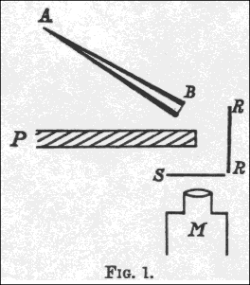 These results were published in a 1909 paper, On a Diffuse Reflection of the α-Particles,[37] where Geiger and Marsden described the experiment by which they proved that alpha particles can indeed be scattered by more than 90°. In their experiment, they prepared a small conical glass tube (AB) containing "radium emanation" (radon), "radium A" (actual radium), and "radium C" (bismuth-214); its open end was sealed with mica. This was their alpha particle emitter. They then set up a lead plate (P), behind which they placed a fluorescent screen (S). The tube was held on the opposite side of plate, such that the alpha particles it emitted could not directly strike the screen. They noticed a few scintillations on the screen because some alpha particles got around the plate by bouncing off air molecules. They then placed a metal foil (R) to the side of the lead plate. They tested with lead, gold, tin, aluminium, copper, silver, iron, and platinum. They pointed the tube at the foil to see if the alpha particles would bounce off it and strike the screen on the other side of the plate, and observed an increase in the number of scintillations on the screen. Counting the scintillations, they observed that metals with higher atomic mass, such as gold, reflected more alpha particles than lighter ones such as aluminium.[37][22]: 20