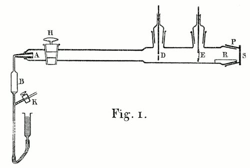 A 1910 paper[38] by Geiger, The Scattering of the α-Particles by Matter, describes an experiment to measure how the most probable angle through which an alpha particle is deflected varies with the material it passes through, the thickness of the material, and the velocity of the alpha particles. He constructed an airtight glass tube from which the air was pumped out. At one end was a bulb (B) containing "radium emanation" (radon-222). By means of mercury, the radon in B was pumped up the narrow glass pipe whose end at A was plugged with mica. At the other end of the tube was a fluorescent zinc sulfide screen (S). The microscope which he used to count the scintillations on the screen was affixed to a vertical millimetre scale with a vernier, which allowed Geiger to precisely measure where the flashes of light appeared on the screen and thus calculate the particles' angles of deflection. The alpha particles emitted from A were narrowed to a beam by a small circular hole at D. Geiger placed a metal foil in the path of the rays at D and E to observe how the zone of flashes changed. He tested gold, tin, silver, copper, and aluminium. He could also vary the velocity of the alpha particles by placing extra sheets of mica or aluminium at A.[38]