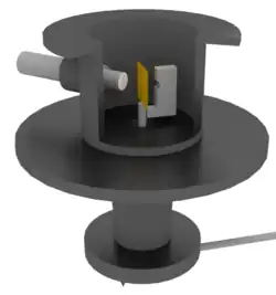 This apparatus was used to measure how the scattering pattern varied in relation to the thickness of the foil, the atomic weight of the material, and the velocity of the alpha particles. The rotating disc in the centre had six holes which could be covered with foil.[40]