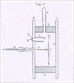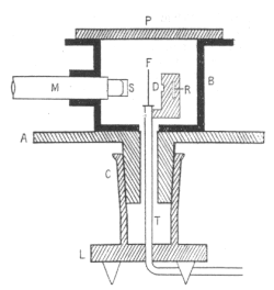 This apparatus was designed to accurately measure the scattering pattern of the alpha particles produced by the metal foil (F). The microscope (M) and screen (S) were affixed to a rotating cylinder and could be moved in a full circle around the foil.[40]