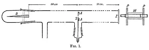 A 1908 paper by Geiger, On the Scattering of α-Particles by Matter, describes the following experiment. He constructed a long glass tube, nearly two metres long. At one end of the tube was a quantity of "radium emanation" (R) as a source of alpha particles.[22]: 20  The opposite end of the tube was covered with a phosphorescent screen (Z). In the middle of the tube was a 0.9 mm-wide slit. The alpha particles from R passed through the slit and created a glowing patch of light on the screen. A microscope (M) was used to count the scintillations on the screen and measure their spread. Geiger pumped all the air out of the tube so that the alpha particles would be unobstructed, and they left a neat and tight image on the screen that corresponded to the shape of the slit. Geiger then allowed some air into the tube, and the glowing patch became more diffuse. Geiger then pumped out the air and placed one or two gold foils over the slit at AA. This too caused the patch of light on the screen to become more spread out, with the larger spread for two layers.[22]: 20  This experiment demonstrated that both air and solid matter could markedly scatter alpha particles.[36][22]: 20