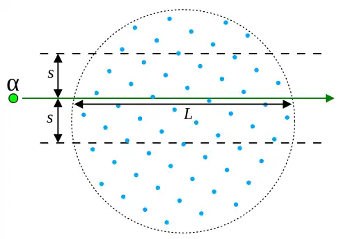 Consider an alpha particle passing through an atom of radius R along a path of length L. The effect of the positive sphere is ignored so as to isolate the effect of the atomic electrons. As with the positive sphere, deflection by the electrons is expected to be very small, to the point that the path is practically a straight line.