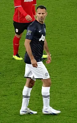The son of rugby union and Wales international rugby league footballer Danny Wilson, Giggs was born in Cardiff but moved to Manchester at the age of six when his father joined Swinton RLFC. Predominantly a left midfielder, he began his career with Manchester City, but joined Manchester United on his 14th birthday in 1987. He made his professional debut for the club in 1991 and spent the next 23 years in the first team. He retired from playing with the end of the 2013–14 season, holding the club record for competitive appearances – 963. Towards the end of the 2013–14 season, he became the club's interim player-manager following the sacking of David Moyes. He was assistant manager under Moyes' permanent replacement, Louis van Gaal. Giggs left United in July 2016, following the appointment of José Mourinho.[12] During his time at United he won 13 Premier League titles – more than any other player in history, four FA Cups, three League Cups, two UEFA Champions League titles, a FIFA Club World Cup, an Intercontinental Cup, a UEFA Super Cup and nine FA Community Shields. Manchester United and Liverpool are the only clubs in English football history to have won more league championships than Giggs.[13]