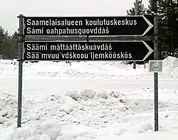 A quadrilingual street sign in Inari in (from top to bottom) Finnish, Northern Saami, Inari Saami, and Skolt Saami, saying Sámi Regional Education Center. Inari is the only municipality in Finland with 4 official languages.