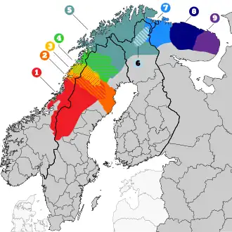 Distribution of the Sami languages (circa 2023): 1. Southern Sámi, 2. Ume Sámi, 3. Pite Sámi, 4. Lule Sámi, 5. Northern Sámi, 6. Inari Sámi, 7. Skolt Sámi, 8. Kildin Sámi, 9. Ter Sámi.